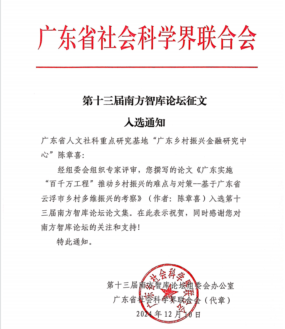 最近,广东乡村振兴金融研究中心陈章喜教授撰写的研究报告《广东实施“百千万工程”推动乡村振兴的难点与对策——基于广东省云浮市乡村多维振兴的考察》入选第十三届南方智库论坛征文论文集。该报告在对广东省乡村振兴典型区域云浮市乡村振兴的产业、组织、文化、生态等进行全方位和系统调研分析基础上,就广东乡村振兴中的难点问题进行了探讨并提出了若干政策建议。
