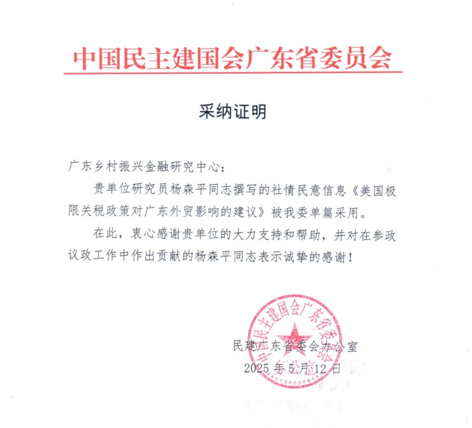近日,中心研究员杨森平教授撰写的社情民意信息《美国极限关税政策对广东外贸影响的建议》被中国民主建国会广东省委员会单篇采用。